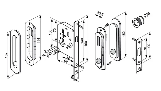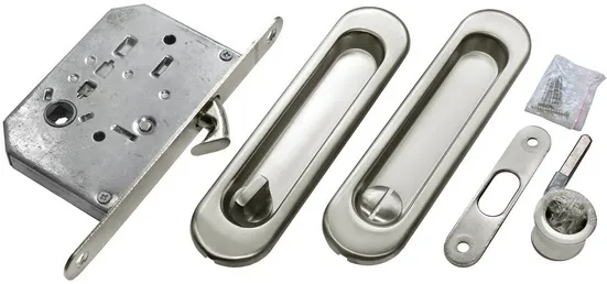 Комплект ручек для раздвижных дверей с механизмом, позволяющим запереть дверь с помощью завертки, или фиксатора.