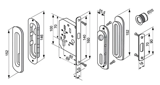 Комплект фурнитуры для раздвижных дверей с замком создан для фиксации раздвижного полотна двери в закрытом состоянии, для чего стандартный ригель был заменён крючкообразным. Крючок цепляется за ответную планку, следовательно, с краю должна располагаться прочная доска для её крепления. Набор метизов входят в комплект изделия.