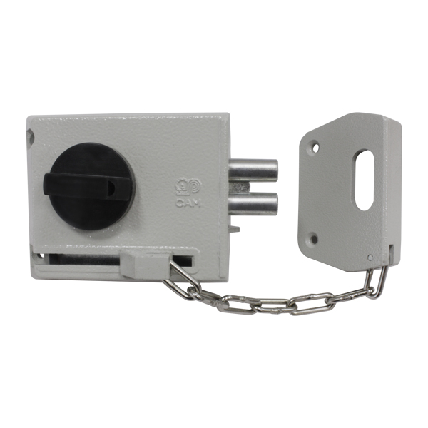 Замок накладной ЗНД-1АК предназначен для запирания левых дверей толщиной от 35 до 45 мм открываемых вовнутрь. Сертифицирован согласно 2ому классу безопасности. Литой корпус выполнен из алюминиевого сплава. Запирание замка происходит автоматически без ключа пpи закрывании двери. Дополнительно запирается на цепочку. Цепочка выдерживает нагрузку на разрыв - 2 000 Н. Цвет: серый муар.