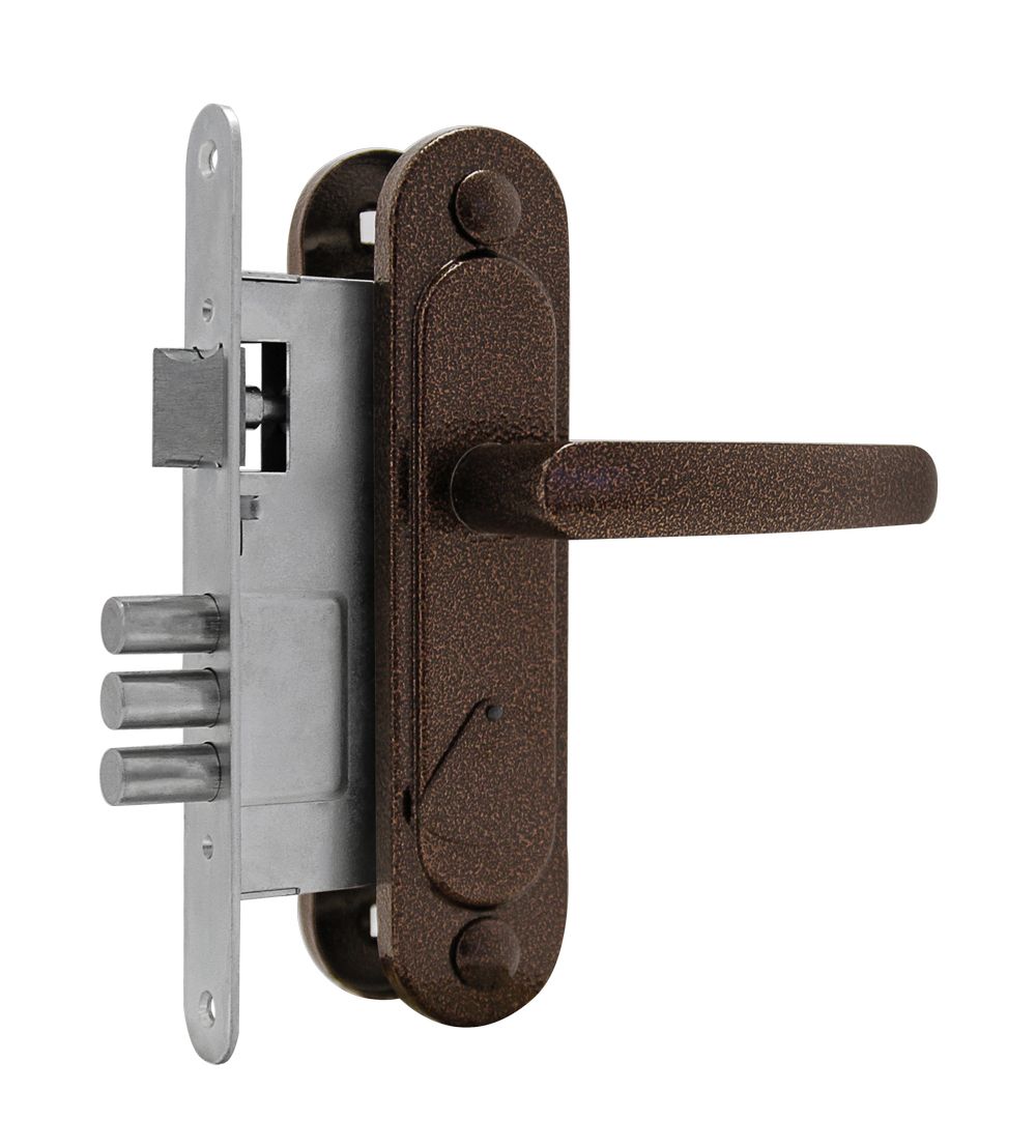 Замок врезной сувальдный ЗВ9 предназначен для установки в деревянные и стальные двери толщиной до 50мм, правого и левого открывании. Засов из трех стальных цилиндрических ригелей диаметром 12мм. Ручки на планке покрыты полимерной краской, цвет: медь. В фалевые ручки добавлены пружины и фиксаторы, что исключает «провисание» ручек и обеспечивает четкую фиксацию их положения.