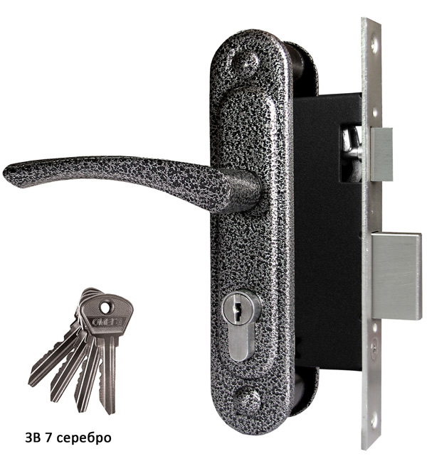Замок врезной ЗВ7 с ручками предназначен для установки в деревянные и стальные двери толщиной до 50 мм, правого и левого открывания. Ригель прямоугольный. Материал ригеля и защелки выполнен из цинкового сплава. Межосевое расстояние 55 мм. Ручки на планке покрыты полимерной краской, цвет: серебро. В фалевые ручки добавлены пружины и фиксаторы, что исключает «провисание» ручек и обеспечивает четкую фиксацию их положения. Комплектуется цилиндровым механизмом 70 мм, 4-мя ключами, ответной планкой и винтовыми стяжками.