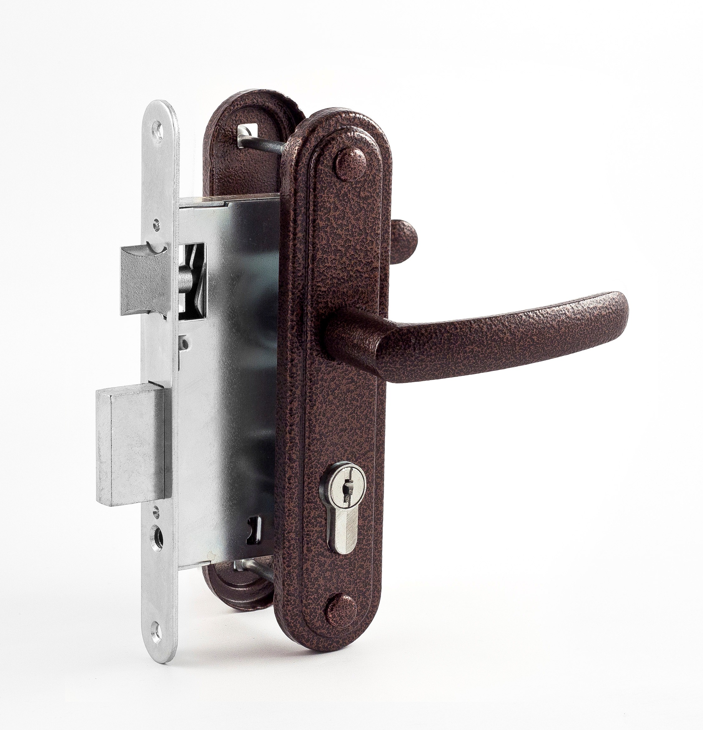 Замок врезной цилиндровый ЗВ7.02 с ручками предназначен для установки в деревянные и стальные двери толщиной до 50 мм, левого и правого открывания. Ручки-накладки покрыты полимерной краской. В ручки фалевые добавлены пружины и фиксаторы, что исключает провисание ручек и обеспечивает четкую фиксацию их положения. Прямоугольный ригель. Ригель и защелка выполнены из цинкового сплава. Межосевое расстояние 55 мм.  Комплектуется цилиндровым механизмом 70 мм, 4-мя ключами, ответной планкой и крепежной фурнитурой. Цвет: медь.