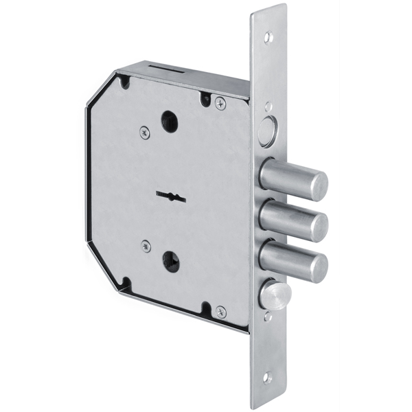 Плоскосувальдный, с двумя внутренними тягами, 3-х ригельный засов, диаметр ригелей, защелки и задвижки - 18 мм, вылет засова  40 мм за 4 оборота, 5 ключей в комплекте. 4 класс.