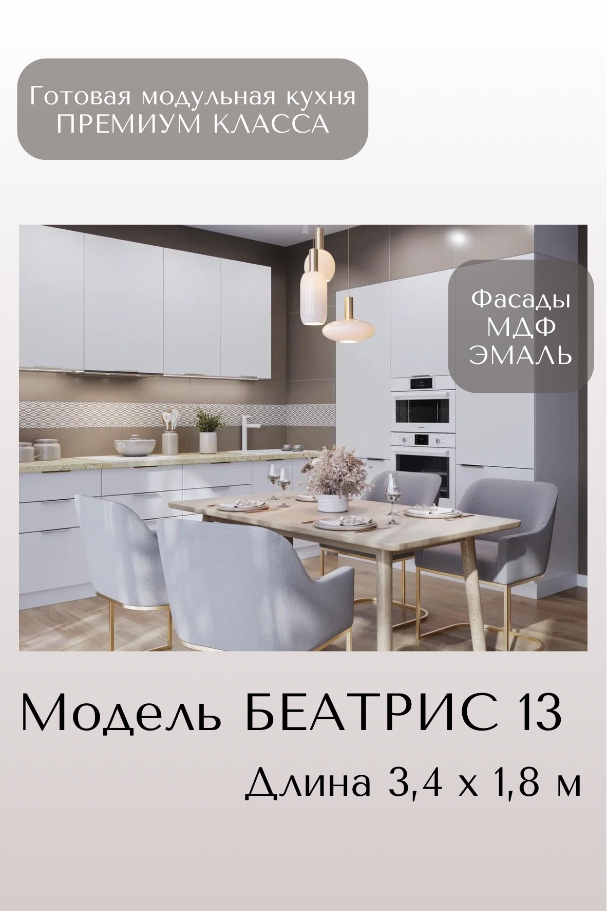 Дополнительно приобретается: пластиковый цоколь, высота подбирается в зависимости от выстроенной высоты ножек от 100 до 150 мм, столешница (предусмотрена толщина как 28 мм, так и 38 мм), техника, мойка, ручки (могут быть использованы как торцевые, так и фасадные).