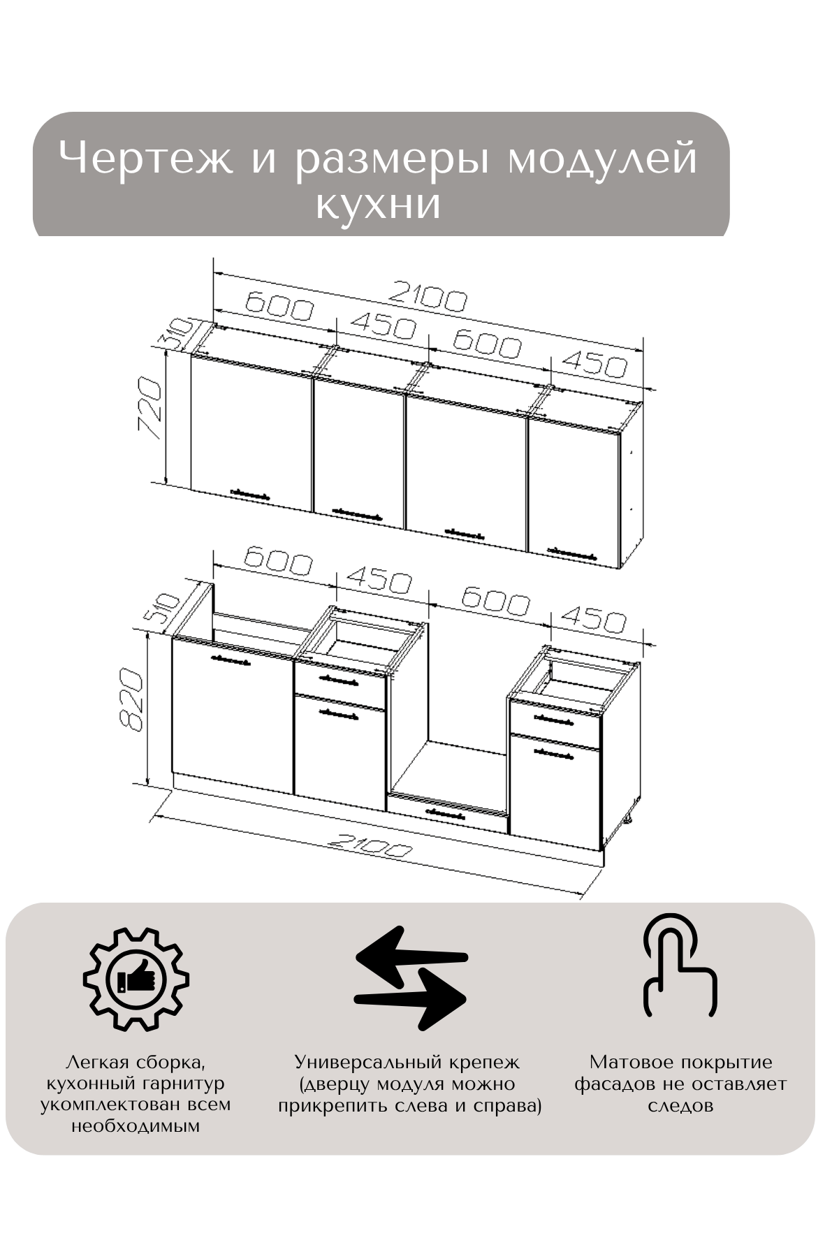 В комплект входит: верхние, нижние модуля (корпус и фасады), все крепления, ножки-опоры регулируемые от 100 до 150 мм.