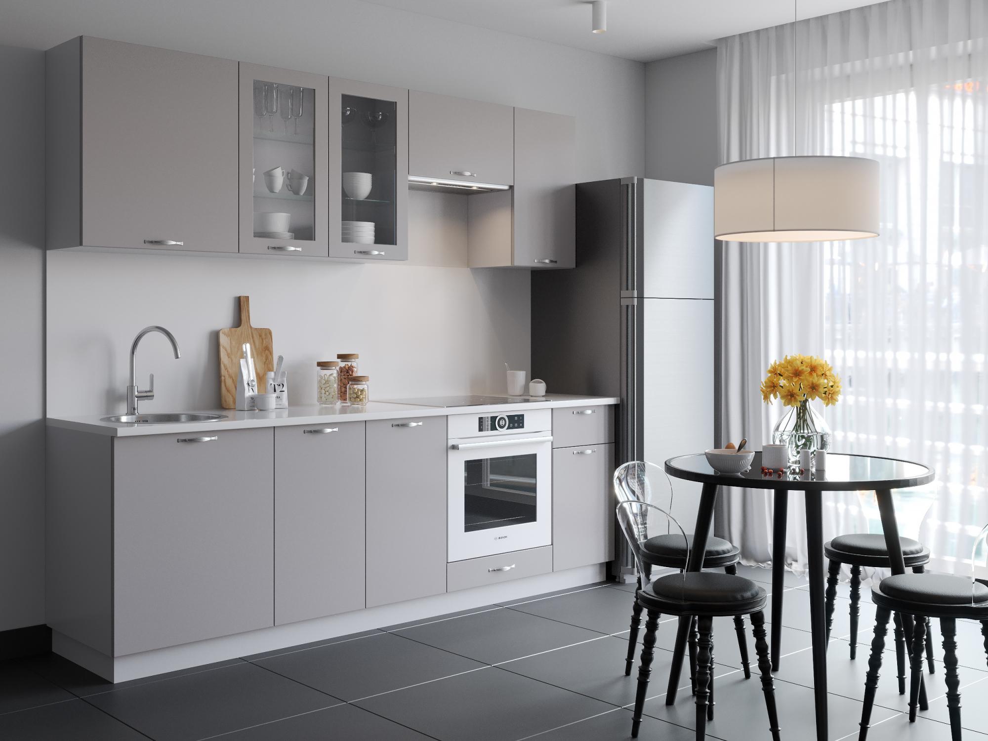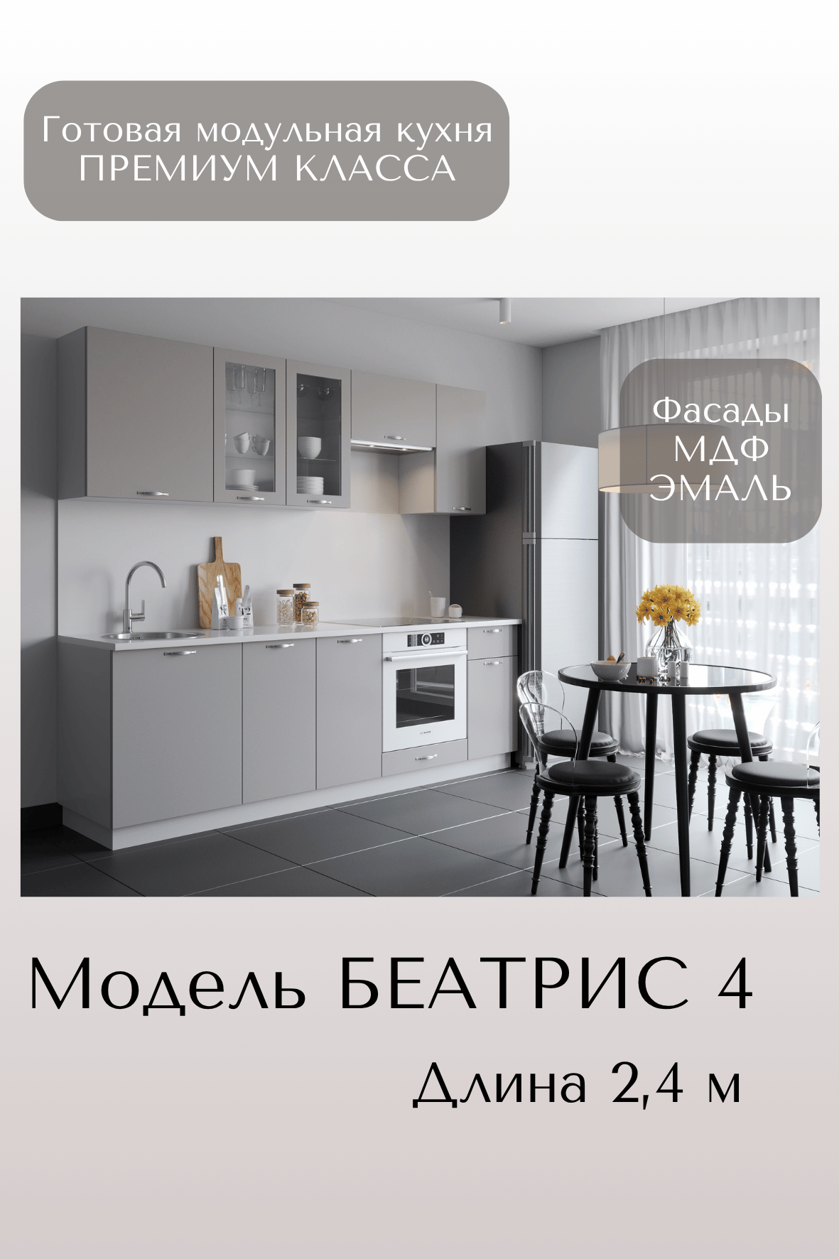 Дополнительно приобретается: пластиковый цоколь, высота подбирается в зависимости от выстроенной высоты ножек от 100 до 150 мм, столешница (предусмотрена толщина как 28 мм, так и 38 мм), техника, мойка, ручки (могут быть использованы как торцевые, так и фасадные).