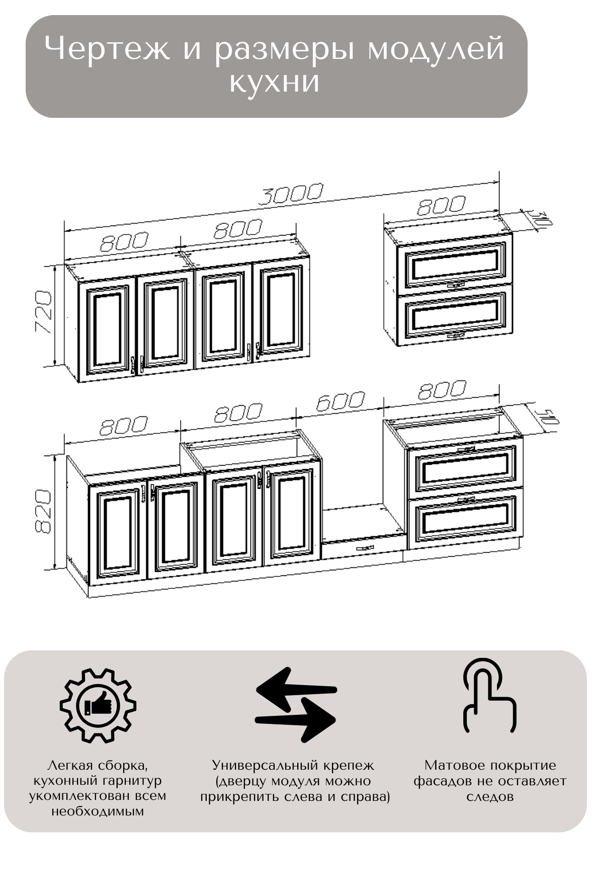 В комплект входит: верхние, нижние модуля (корпус и фасады), все крепления, ножки-опоры регулируемые от 100 до 150 мм.