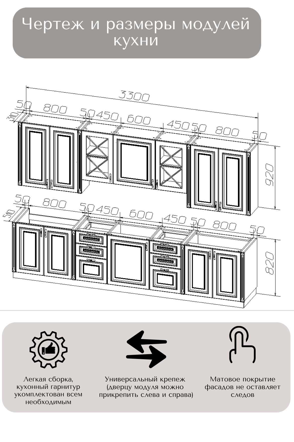 В комплект входит: верхние, нижние модуля (корпус и фасады), все крепления, ножки-опоры регулируемые от 100 до 150 мм.