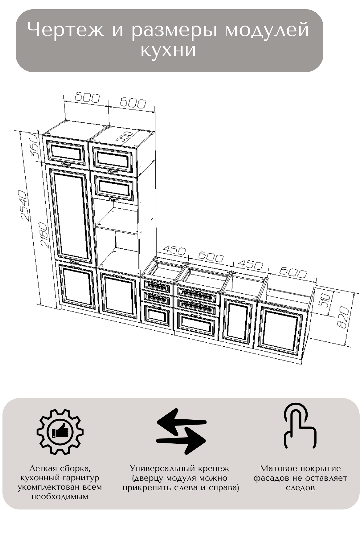 В комплект входит: верхние, нижние модуля (корпус и фасады), все крепления, ножки-опоры регулируемые от 100 до 150 мм.