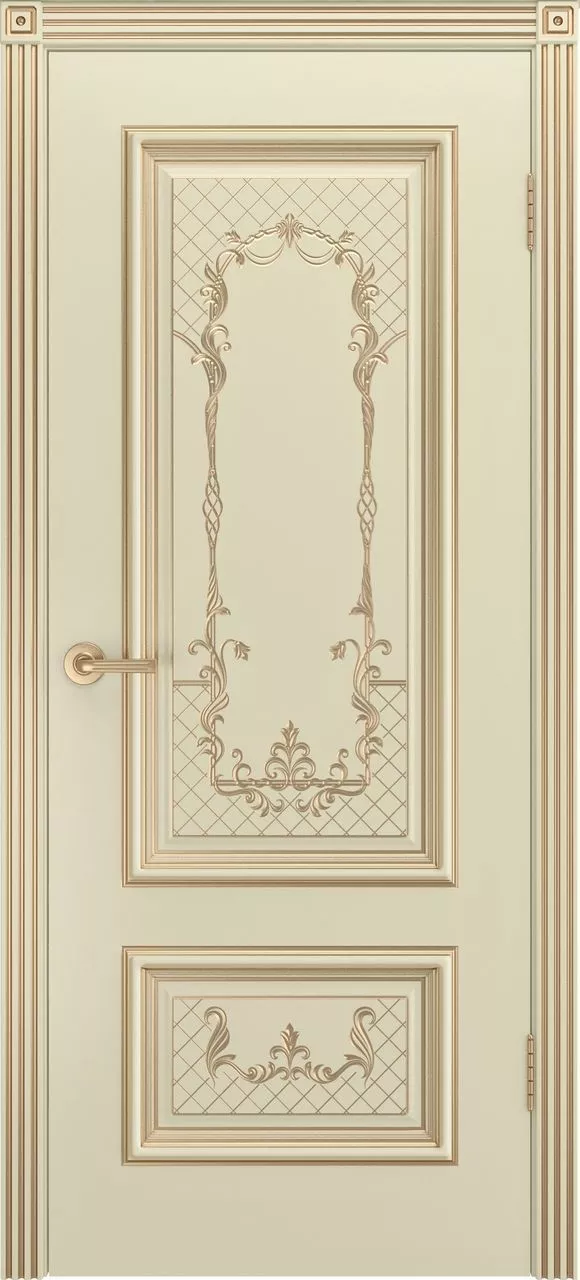 Дверь Дуэт R-0 В3 ДГ имеет каркасно-щитовую конструкцию с фрезерованной поверхностью полотна, имитирующей филенки, и цельным багетом без узора. Также имеется фигурная фрезеровка на «филенках». Модель покрыта эмалью.