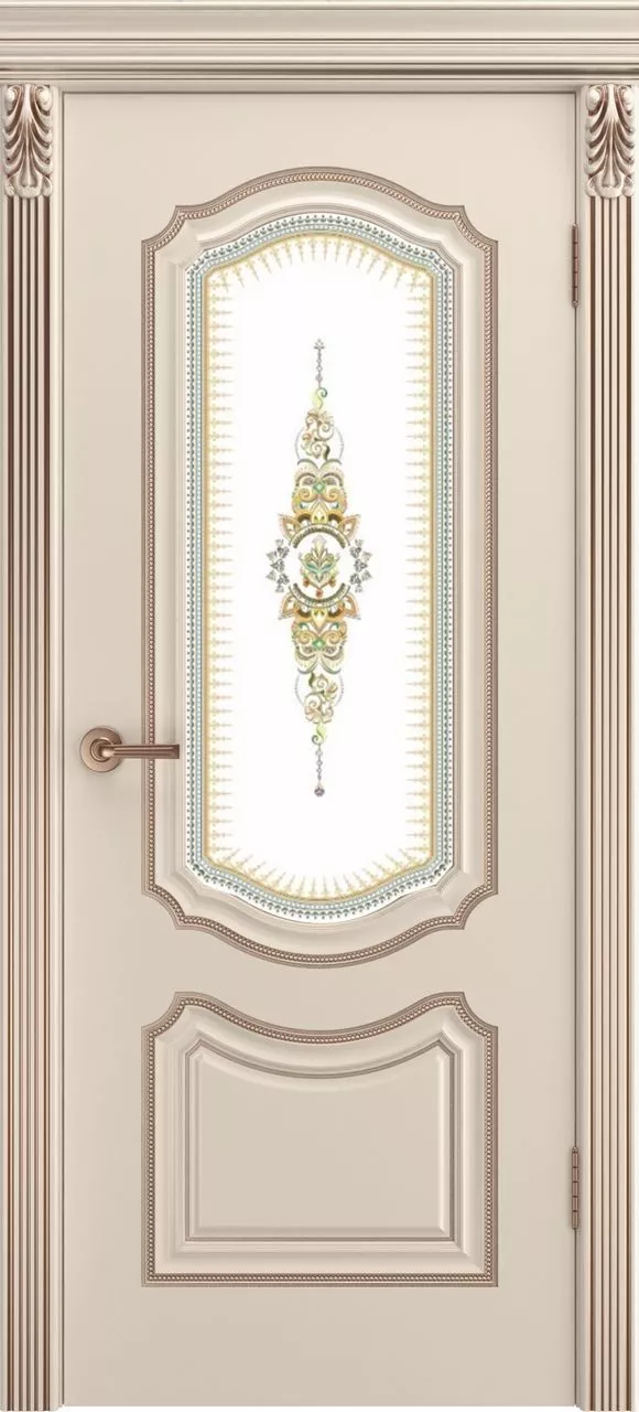 Дверь Сюита Лакшери В0 ДО имеет каркасно-щитовую конструкцию с фрезерованной поверхностью полотна, имитирующей филенки. Фрезеровка «рамка» отсутствует. Модель имеет остекление с фотопечатью верхней и центральной филенок. Покрыта эмалью.