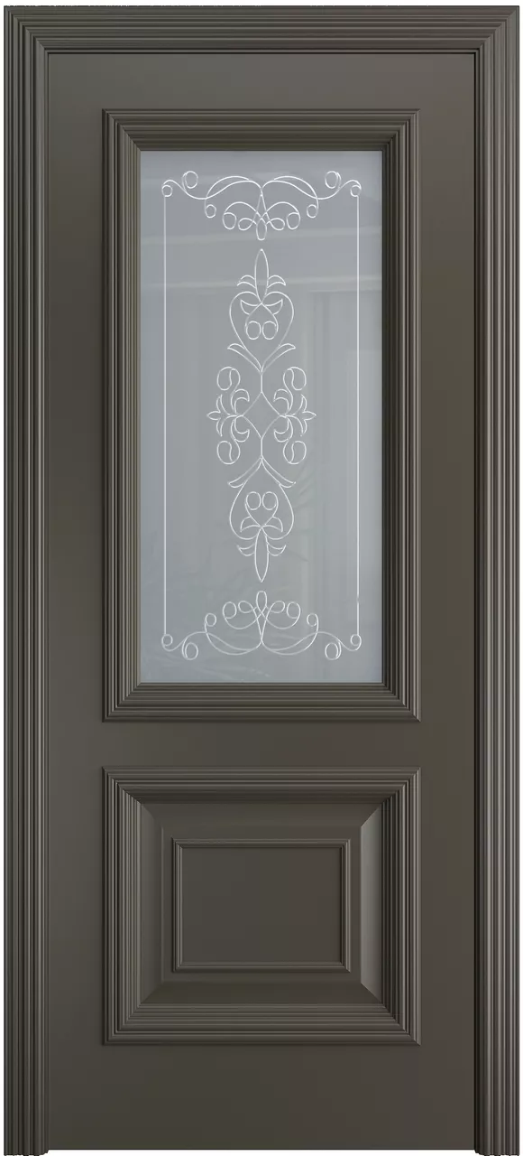 Дверь Сорренто ДО имеет каркасно-щитовую конструкцию с фрезерованной поверхностью полотна, имитирующей филенки, и накладным багетом. Модель покрыта эмалью и остеклена на выбор белым или бронзовым стеклом с гравировкой или контурным витражом либо сатинатом с УФ-печатью.