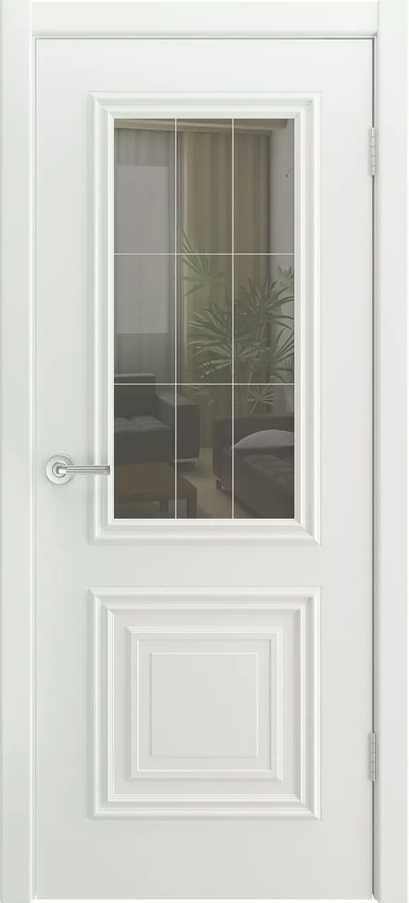Дверь Турин-2 ДО имеет каркасно-щитовую конструкцию с фрезерованной поверхностью полотна, имитирующей филенки, и цельным багетом. Модель покрыта эмалью и остеклена рефлективом либо сатинатом. Также на выбор можно нанести фотопечать либо графировку на стекло.