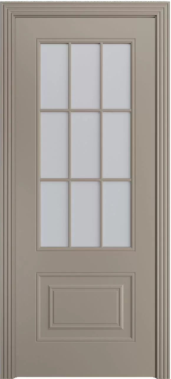 Дверь Версаль-Ф Loft (9) ДО имеет каркасно-щитовую конструкцию с фрезерованной поверхностью полотна и английской решеткой на 9 квадратов. Модель остеклена светлым или темным сатинатом на выбор и покрыта эмалью.