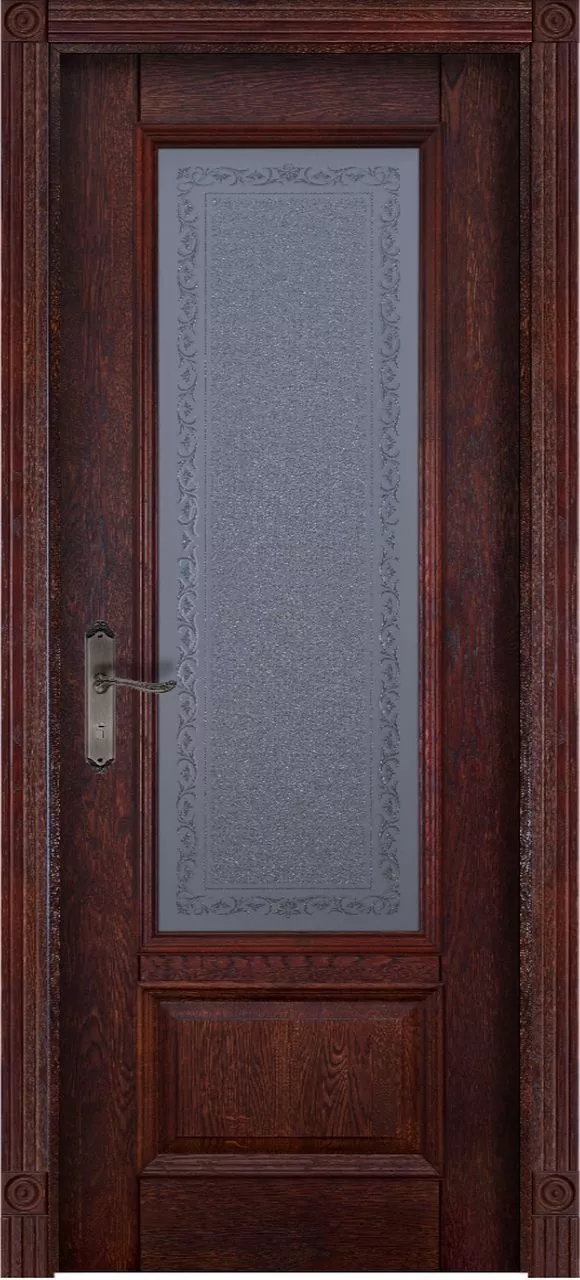 Дверь Аристократ №4 ДО имеет сборную царговую конструкцию с фрезерованной поверхностью полотна. Остекление закаленным стеклом «кристаллайзер». Модель изготовлена из массива ольхи, на выбор покрыта тонировкой (бейц) или эмалью.
