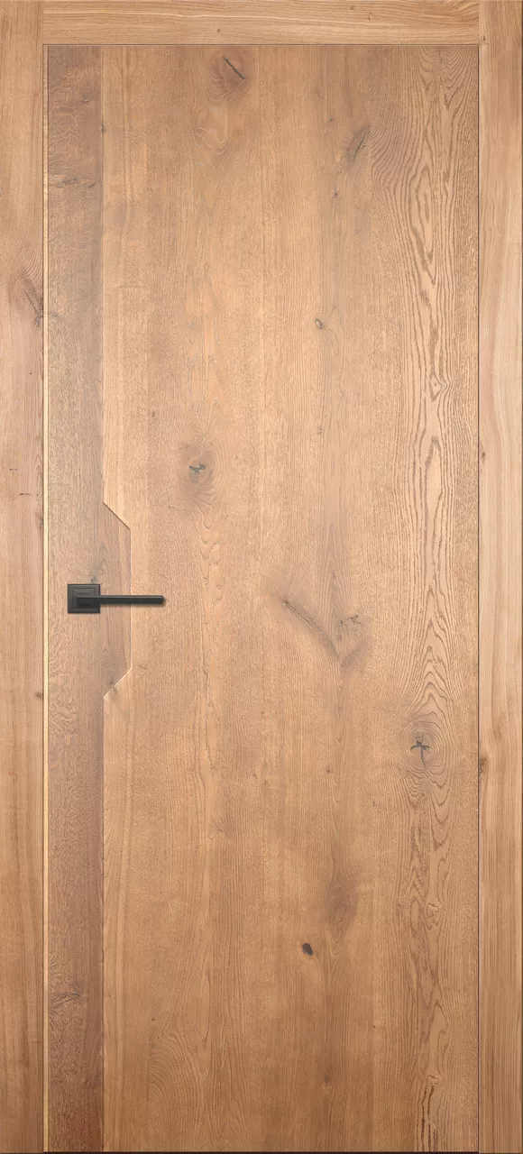 Дверь Легно-5 ДГ имеет каркасно-щитовую конструкцию с фрезерованной поверхностью полотна. Модель изготовлена по технологии DSW из внутренней рамки с цельным заполнением массивом и оклеена дубовыми щитами из нерошенной рустикальной ламели дуба. Покрыта морилкой и водным лаком.
