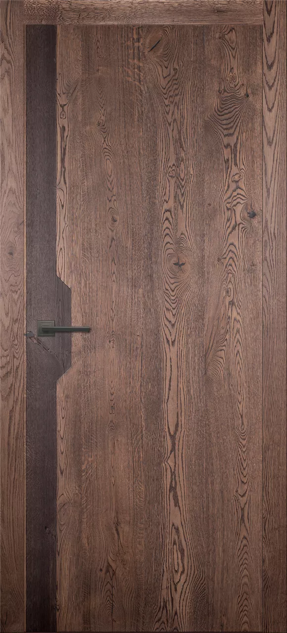 Дверь Легно-5 ДГ имеет каркасно-щитовую конструкцию с фрезерованной поверхностью полотна. Модель изготовлена по технологии DSW из внутренней рамки с цельным заполнением массивом и оклеена дубовыми щитами из нерошенной рустикальной ламели дуба. Покрыта морилкой и водным лаком.