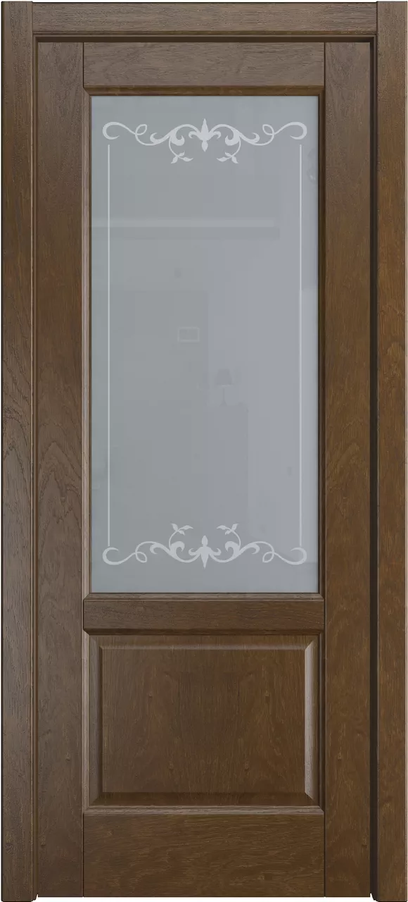 Дверь Ровена ДО имеет сборную конструкцию с фрезерованными филенками. Модель остеклена светлым или матовым стеклом с золотой фотопечатью или пескоструйным рисунком и покрыта натуральным шпоном ясеня или дуба на выбор.