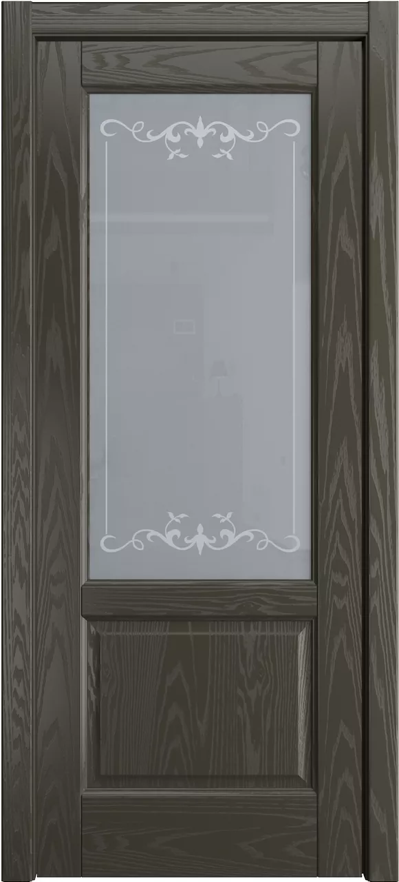 Дверь Ровена ДО имеет сборную конструкцию с фрезерованными филенками. Модель остеклена светлым или матовым стеклом с золотой фотопечатью или пескоструйным рисунком и покрыта натуральным шпоном ясеня или дуба на выбор.