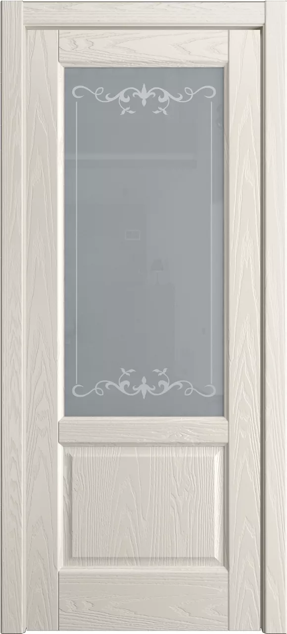 Дверь Ровена ДО имеет сборную конструкцию с фрезерованными филенками. Модель остеклена светлым или матовым стеклом с золотой фотопечатью или пескоструйным рисунком и покрыта натуральным шпоном ясеня или дуба на выбор.