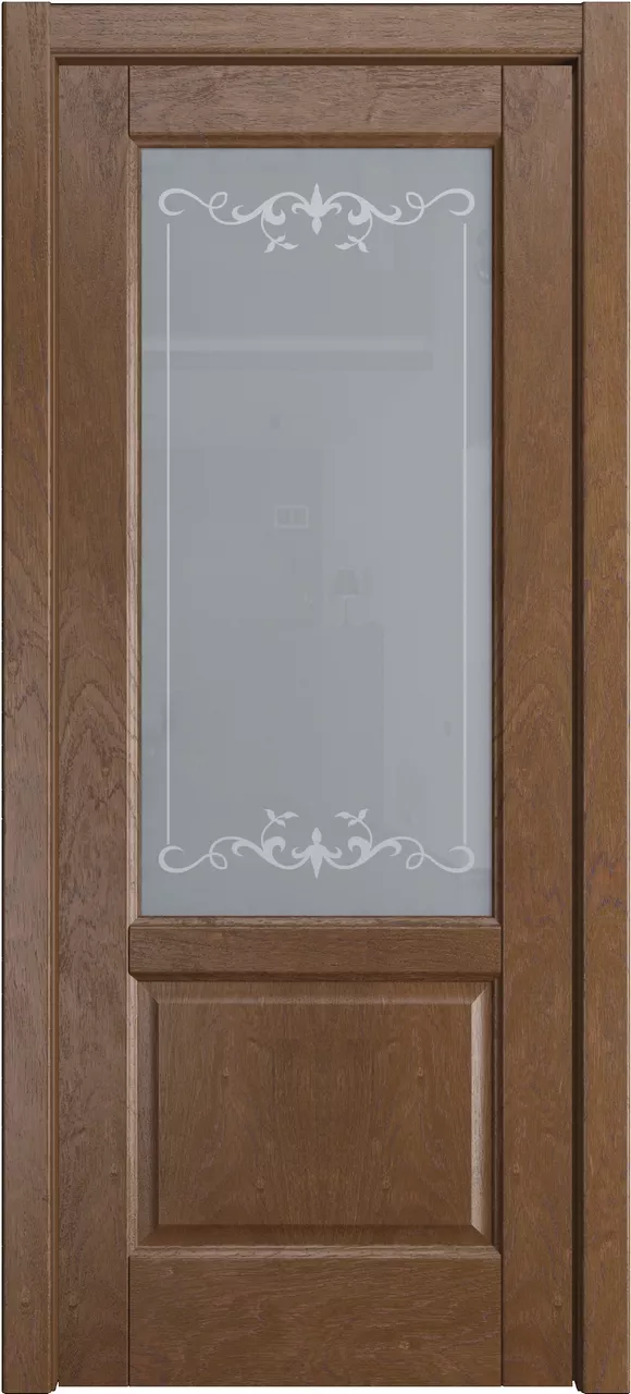 Дверь Ровена ДО имеет сборную конструкцию с фрезерованными филенками. Модель остеклена светлым или матовым стеклом с золотой фотопечатью или пескоструйным рисунком и покрыта натуральным шпоном ясеня или дуба на выбор.