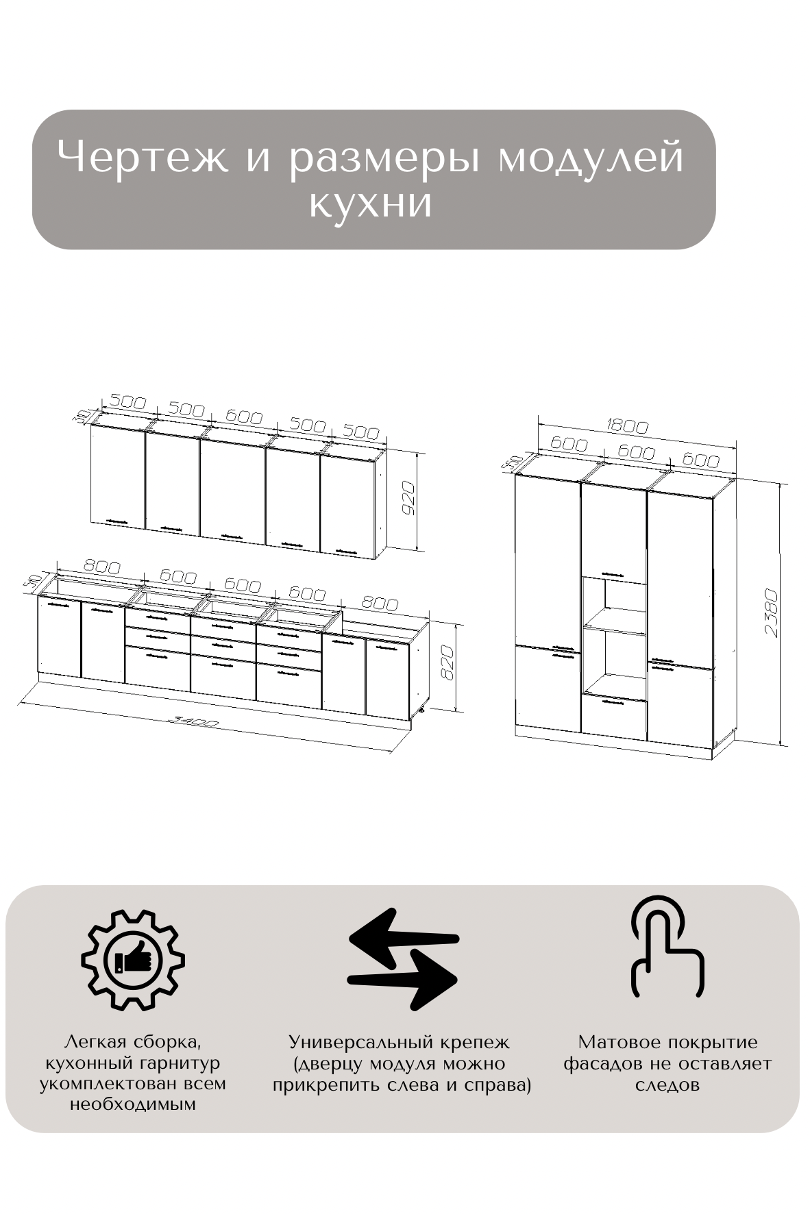 В комплект входит: верхние, нижние модуля (корпус и фасады), все крепления, ножки-опоры регулируемые от 100 до 150 мм.