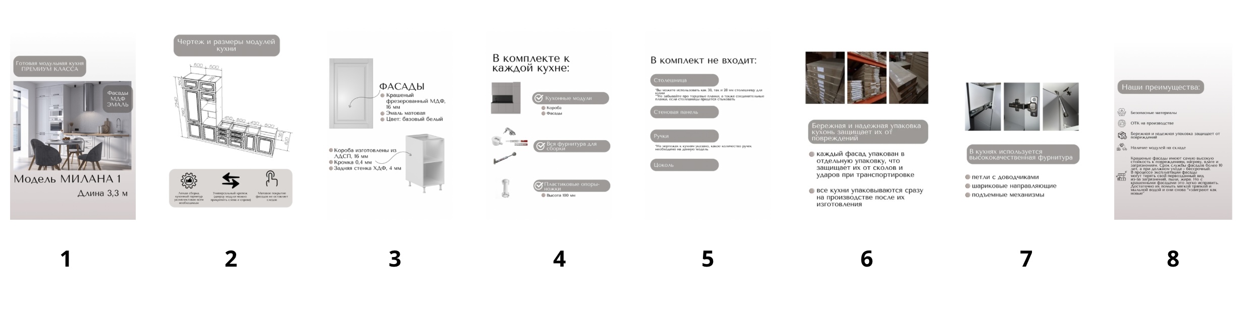 В комплект входит: верхние, нижние модуля (корпус и фасады), все крепления, ножки-опоры регулируемые от 100 до 150 мм.