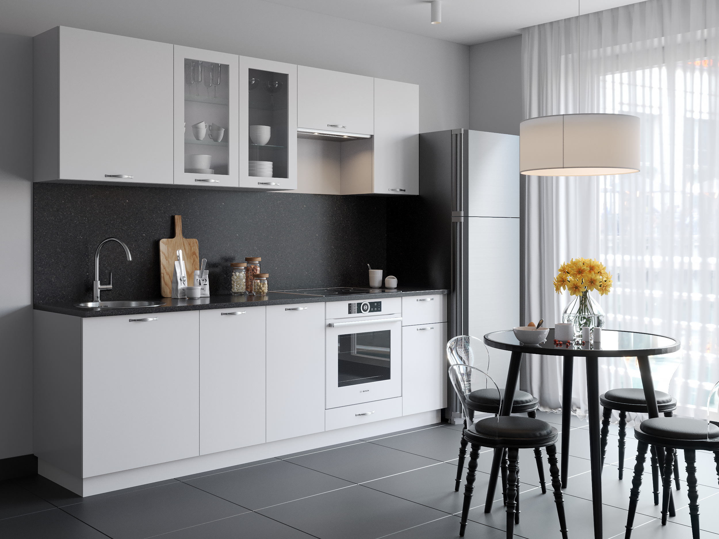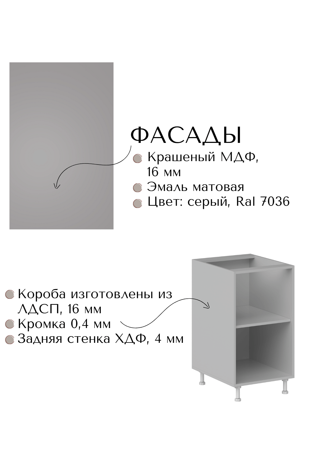 Дополнительно приобретается: пластиковый цоколь, высота подбирается в зависимости от выстроенной высоты ножек от 100 до 150 мм, столешница (предусмотрена толщина как 28 мм, так и 38 мм), техника, мойка, ручки (могут быть использованы как торцевые, так и фасадные).