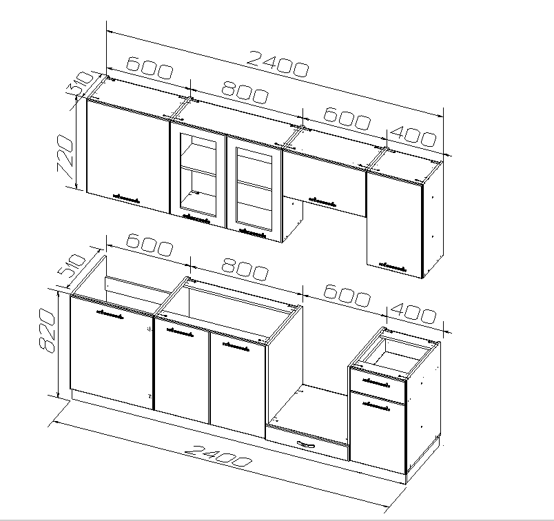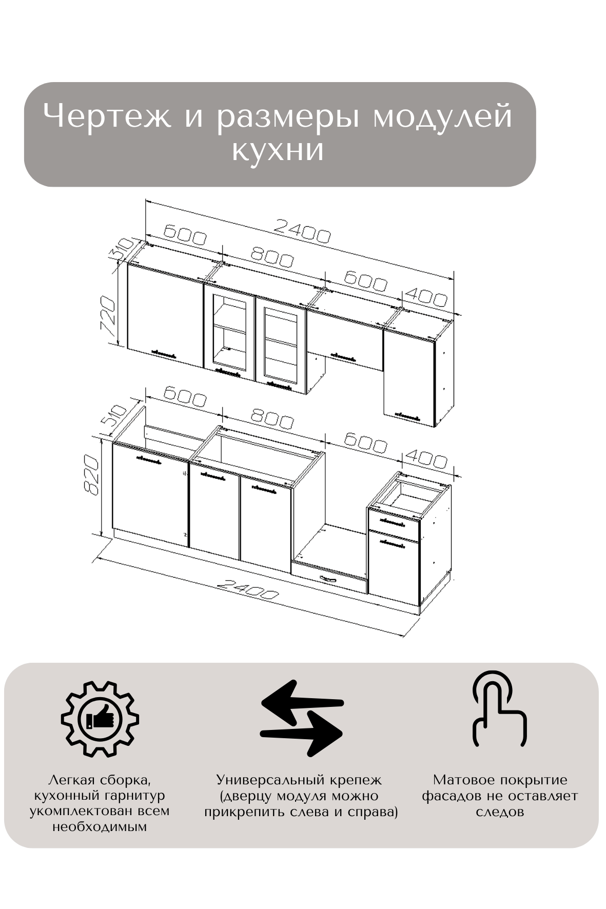 В комплект входит: верхние, нижние модуля (корпус и фасады), все крепления, ножки-опоры регулируемые от 100 до 150 мм.