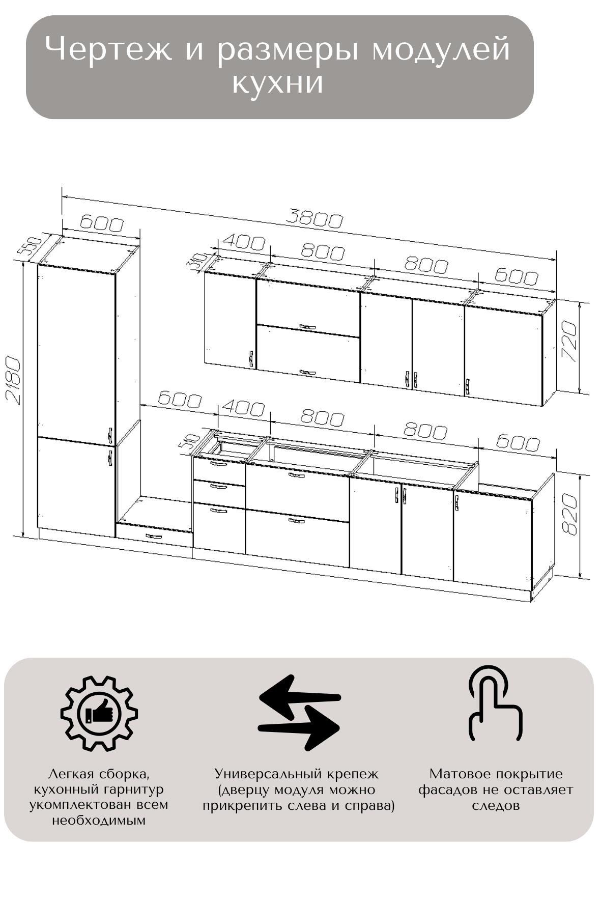 В комплект входит: верхние, нижние модуля (корпус и фасады), все крепления, ножки-опоры регулируемые от 100 до 150 мм.