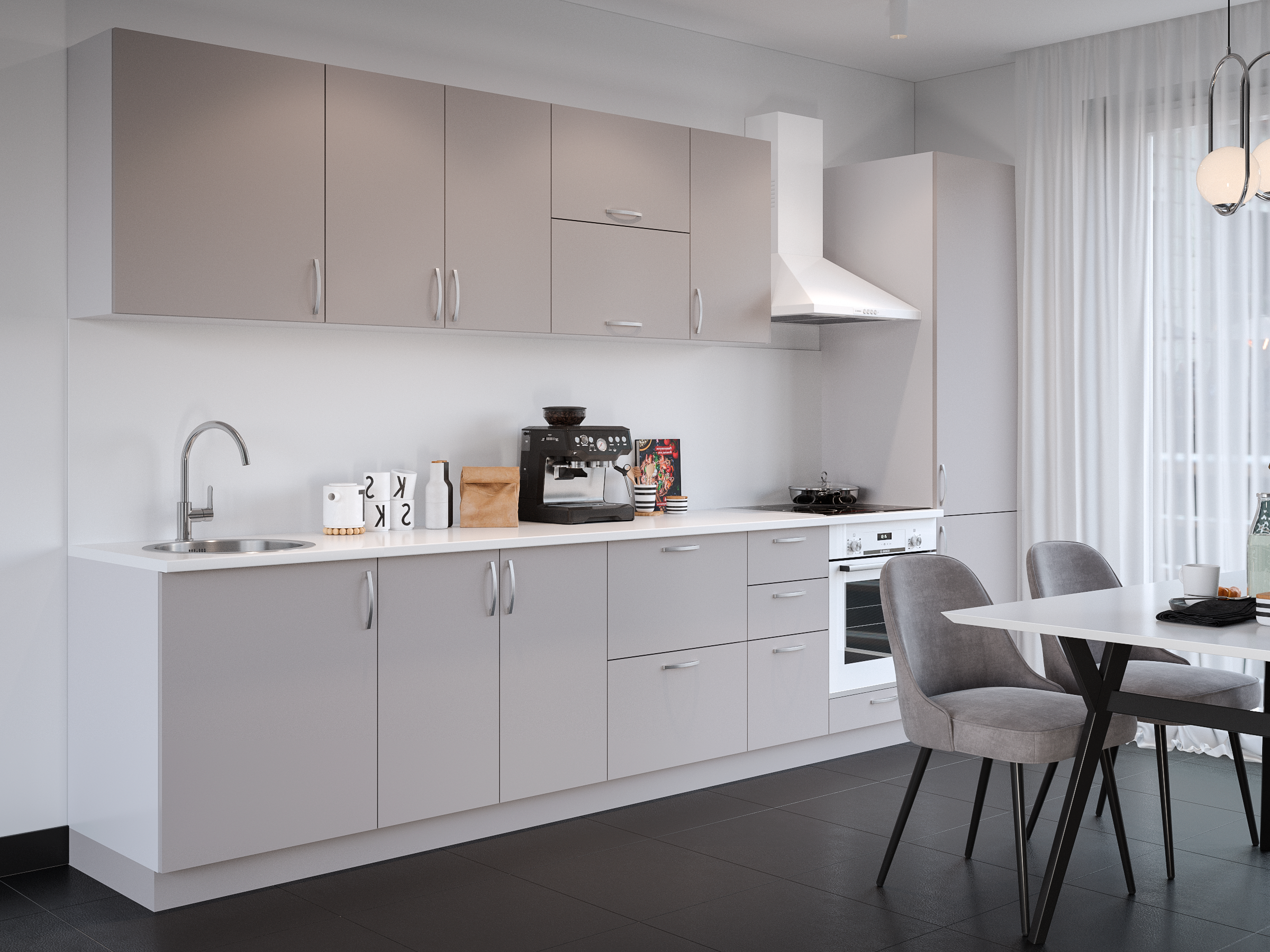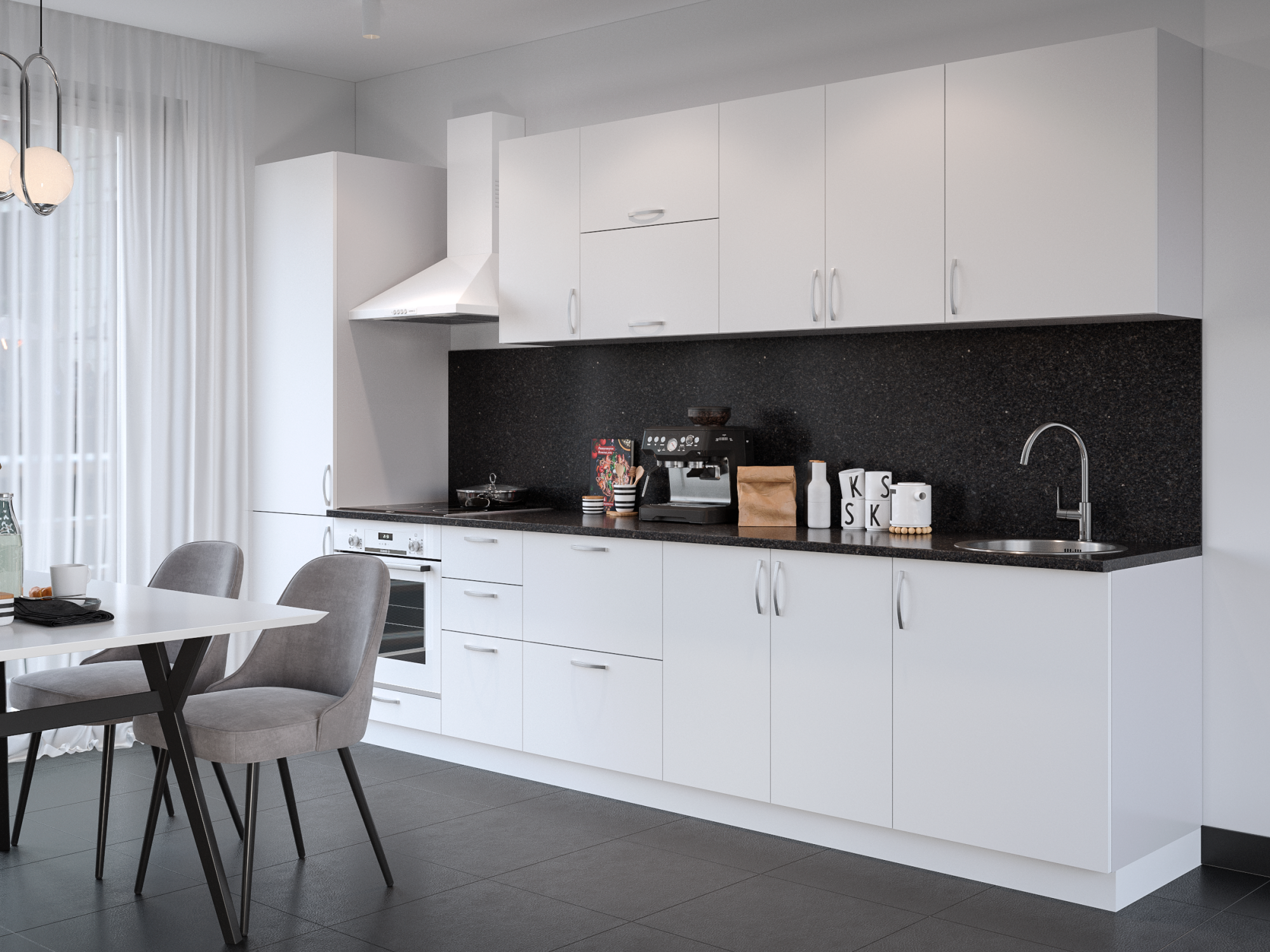Дополнительно приобретается: пластиковый цоколь, высота подбирается в зависимости от выстроенной высоты ножек от 100 до 150 мм, столешница (предусмотрена толщина как 28 мм, так и 38 мм), техника, мойка, ручки (могут быть использованы как торцевые, так и фасадные).