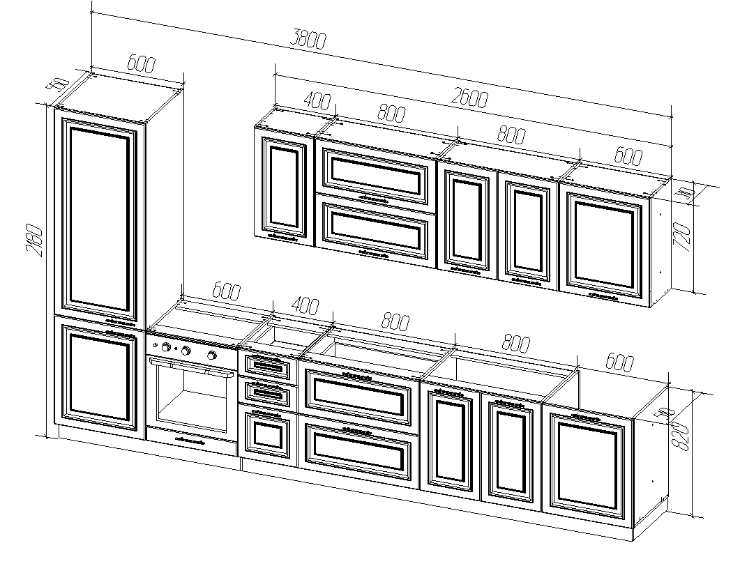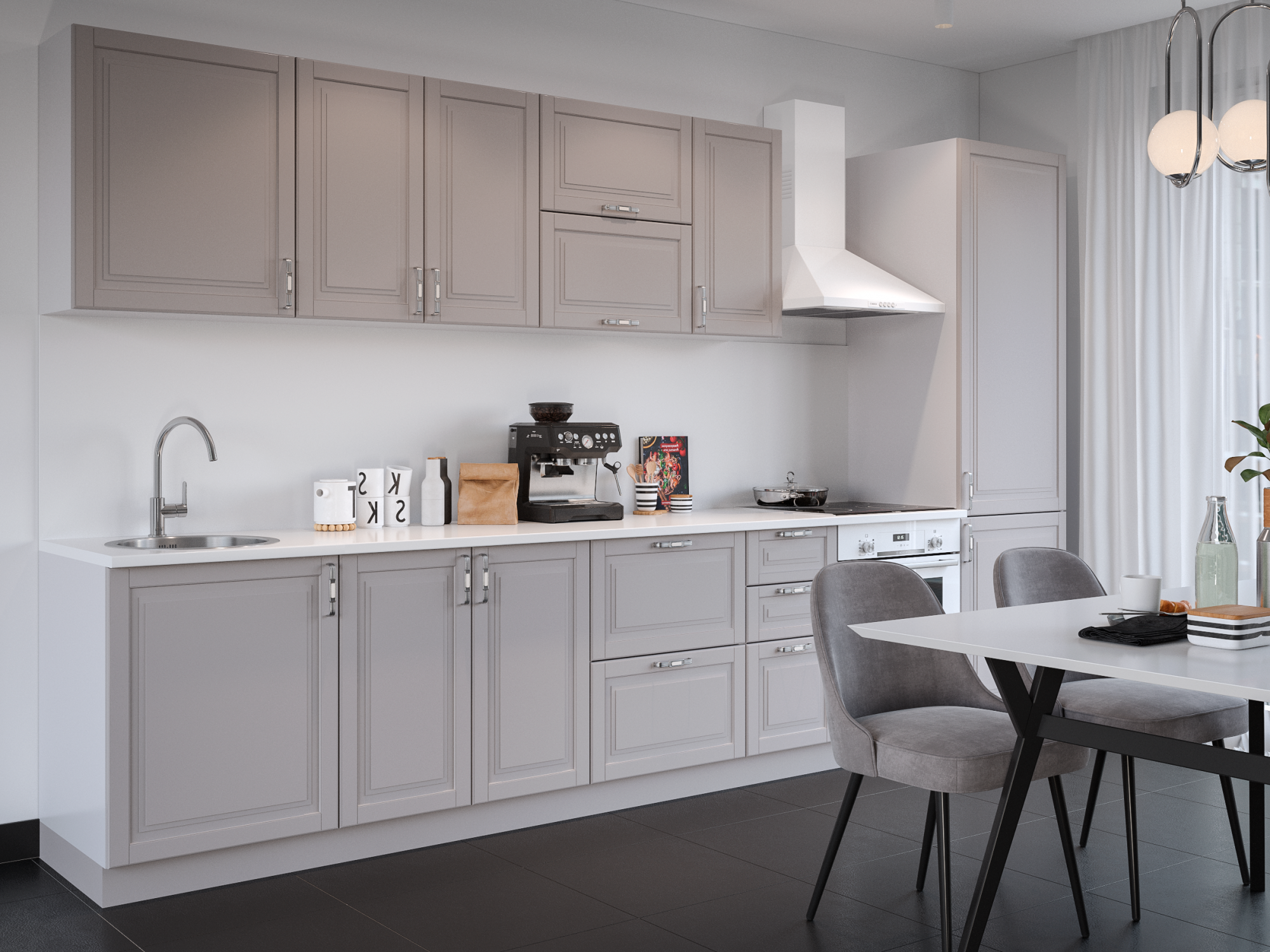 Дополнительно приобретается: пластиковый цоколь, высота подбирается в зависимости от выстроенной высоты ножек от 100 до 150 мм, столешница (предусмотрена толщина как 28 мм, так и 38 мм), техника, мойка, ручки (могут быть использованы как торцевые, так и фасадные).