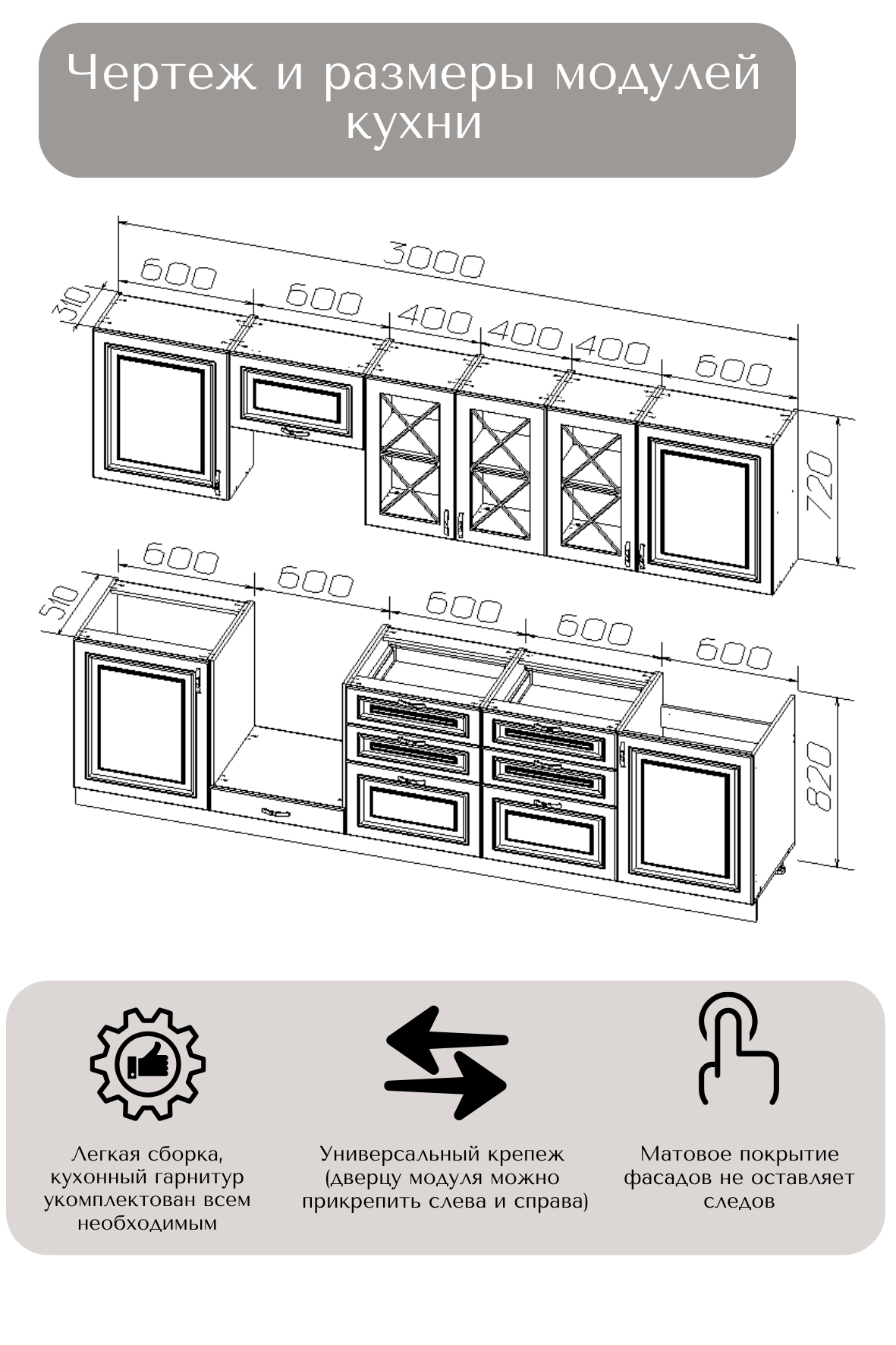 В комплект входит: верхние, нижние модуля (корпус и фасады), все крепления, ножки-опоры регулируемые от 100 до 150 мм.