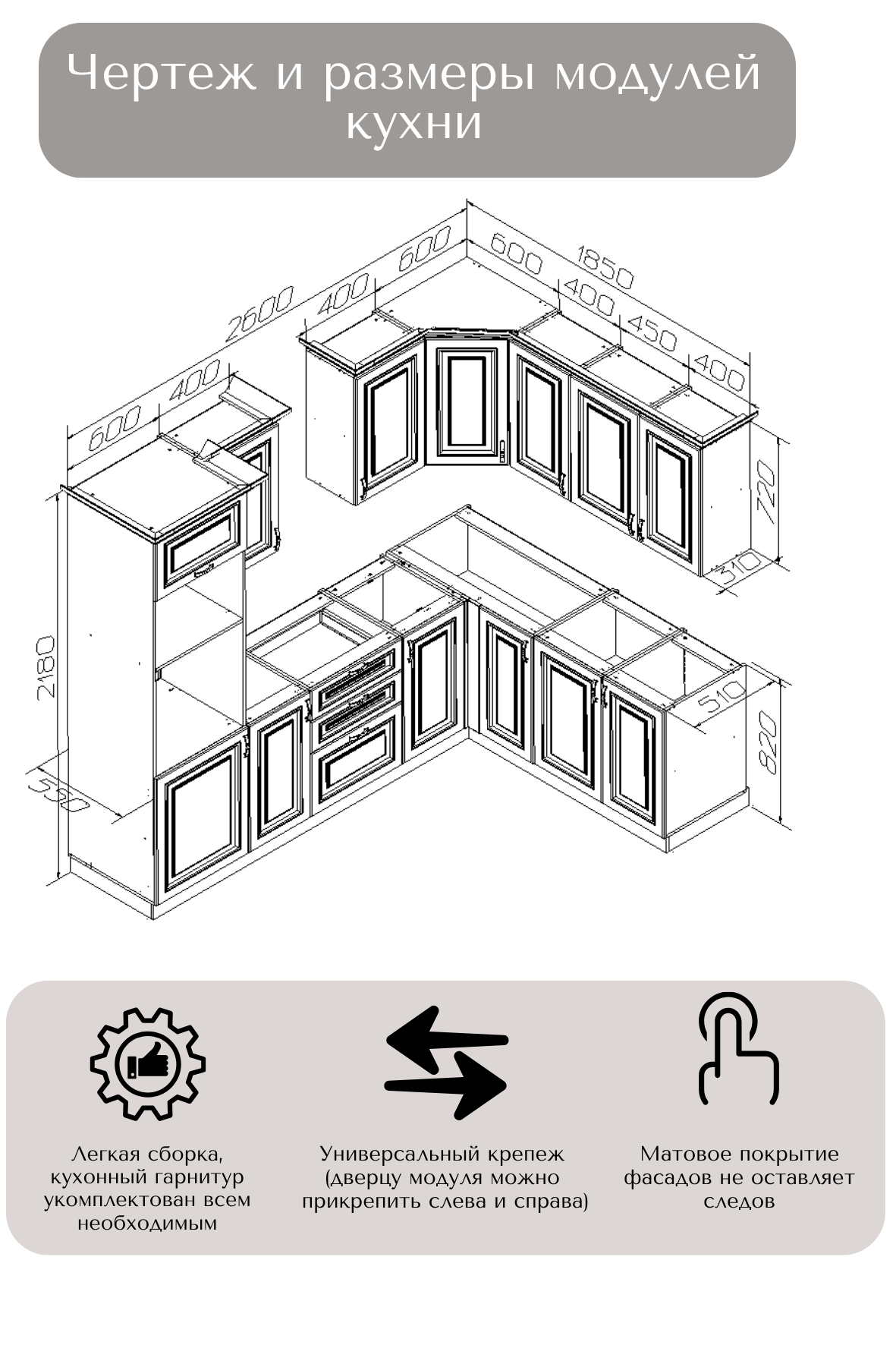 В комплект входит: верхние, нижние модуля (корпус и фасады), все крепления, ножки-опоры регулируемые от 100 до 150 мм.