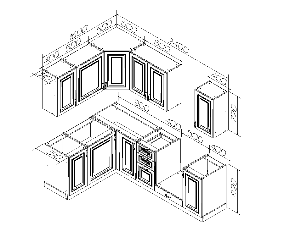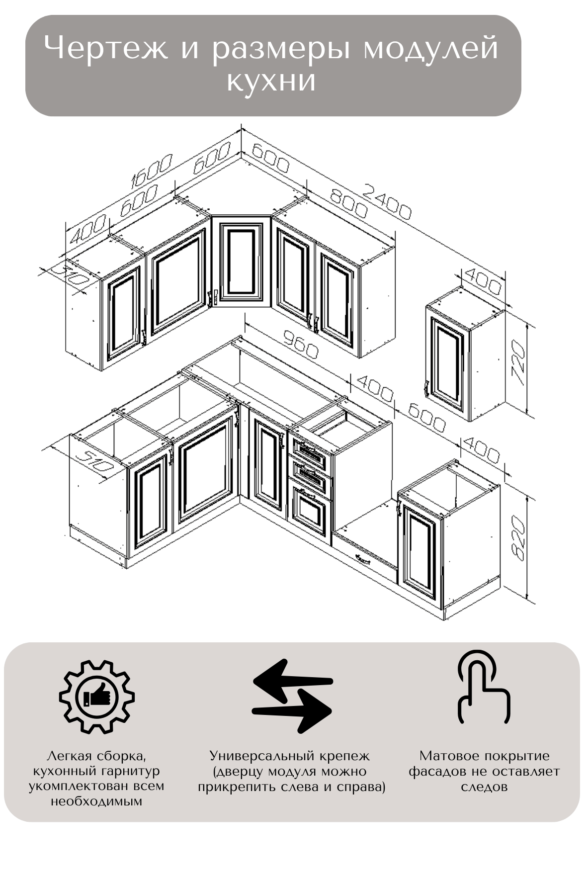 В комплект входит: верхние, нижние модуля (корпус и фасады), все крепления, ножки-опоры регулируемые от 100 до 150 мм.